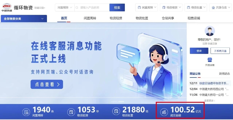 12月14日17時,鐵建云鏈循環(huán)物資平臺自去年4月煥新上線運營以來累計交易額突破100億元大關。